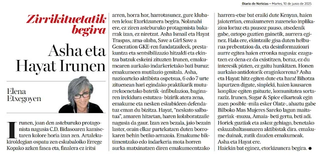 Irunen, joan den asteburuko protagonista nagusia C.D. Bidasoaren kamisetaren kolore horia izan zen. Artaleku-kiroldegian ospatu zen eskubaloiko Errege Kopako azken fasea eta, finalera ez iritsi arren, horra hor, harrotasunez, gure klubaren leloa: Etorkizunera begira. Nolanahi ere, ez ziren asteburuko protagonista bakarrak izan, ez niretzat. Asha Ismail eta Hayat Traspas, ama-alaba, Save a Girl Save a Generation GKE-ren fundatzaileek, prestakuntza eta sentsibilizazio hitzaldi eta ekintza batzuk eskeini zituzten Irunen, emakumearen aurkako indarkerietako bati buruz: emakumeen mutilazio genitala. Asha, nazioarteko aktibista ospetsua, 6 edo 7 urte zituenean hari egindako praktikarik muturrekoenetako batetik -infibulazioa, baginaren irekidura estutzea- bizirik atera zena, emakume eta nesken eskubideen defendatuz eman du bizitza. Hayat, “neskato salbatua”, amaren hitzetan, haren kolaboratzaile nagusia da gaur. Izan zen bezala, jaio bezain laster, orain elkar partekatzen duten borrokaren behin betiko arrazoia. Emakume biktimentzako edo indarkeria mota horren aurka matxinatzen diren emakumeentzako harrera-etxe bat eraiki dute Kenyan, haien jaioterrian, emakumeren zuzeneko inplikazioa lortuz eta pausoz pauso, atsedenik gabe, oztopo guztien gainetik, aurrera eginez. Hala ere, ekintzaile gisa duten helburua prebentzioa da, eta desinformazioari aurre egitea haien erronka nagusia: ezagutzen ez dena ez da existitzen, beraz, ez du interesik pizten, ez gaitu hunkitzen. Honen aurkako antidotorik eraginkorrena? Asha eta Hayat: hitz egiten dute eta hara! Bihotza lapurtzen digute, sinpleki, haien kausaren konplize egiten gaituzte, komunitatea sortaraziz. Irunen, Sugar & Spice elkarteak egin zuen posible -mila esker Olatz-, ahaztu gabe Bilboko Mas Mujeres Sareko lagun maitagarriak -muxu, Amaia- beti gertu, beti adi. Horiek guztiak eta askoz gehiago, benetako eskuzabaltasunaren aktibistak dira. emakume duinak, zutik dauden emakumeak. Asha eta Hayat ere.